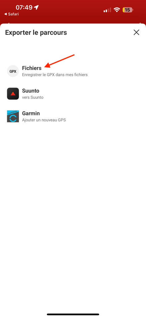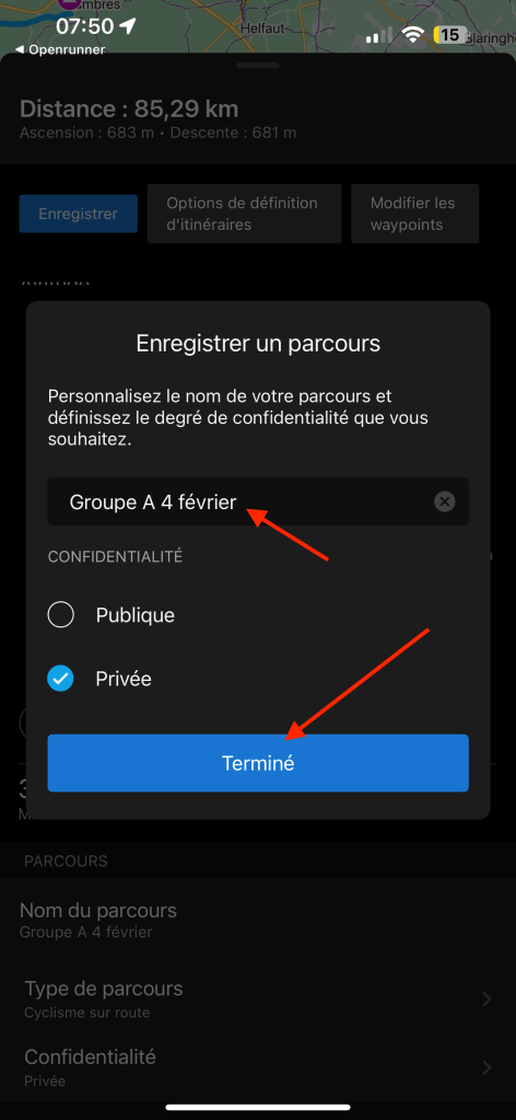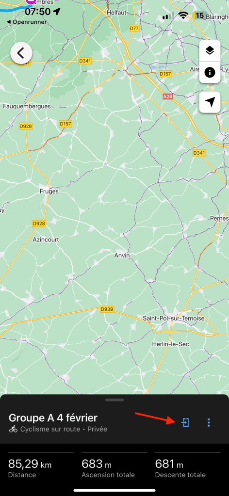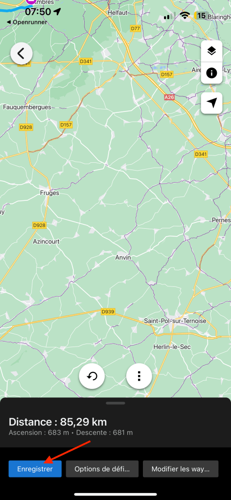 Ne pas oublier d’envoyer le parcours vers le GPS Garmin. Ce dernier doit être connecté au téléphone via le Bluetooth.