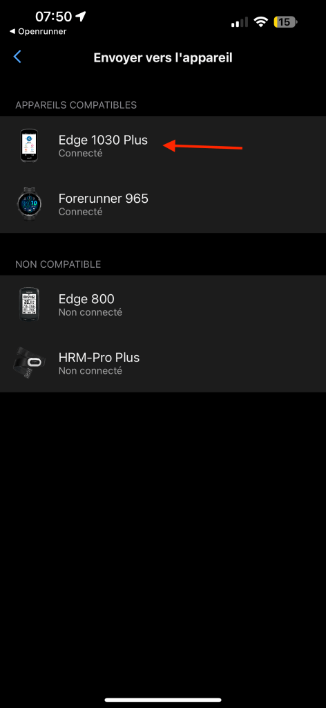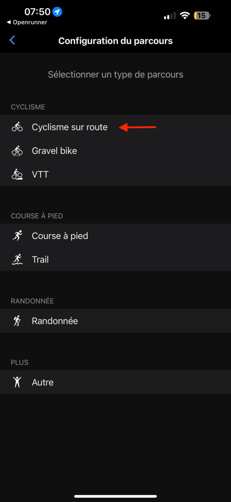 Le fait de sélectionner Garmin Connect ouvre l’application directement sur le téléphone. Il faut choisir l’activité concernée par le parcours (99% du temps « Cyclisme sur route »).